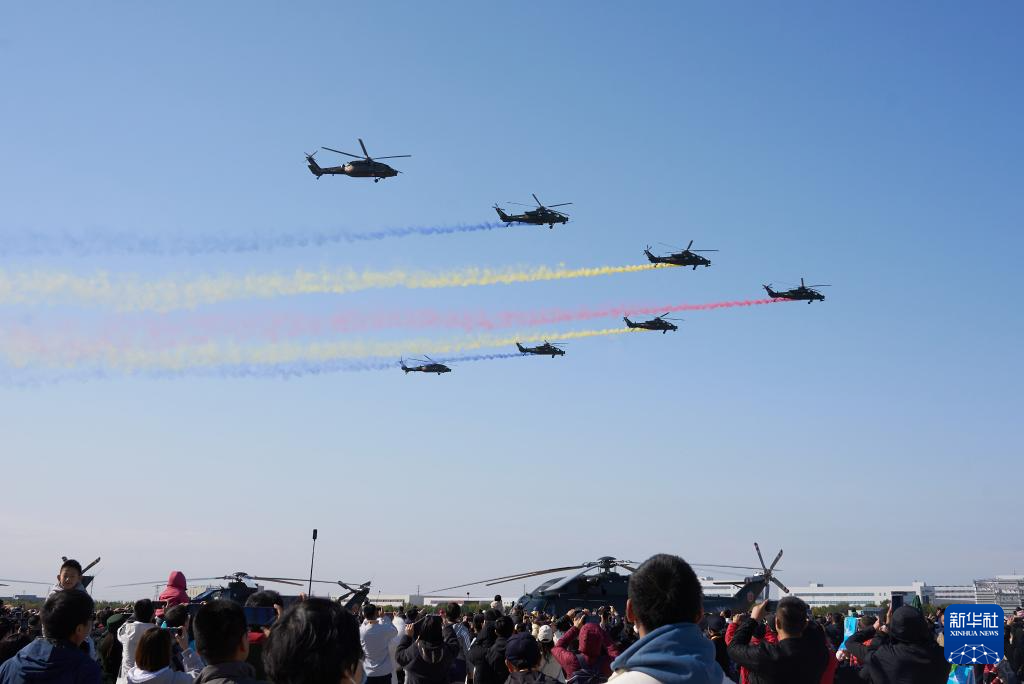 10月18日,陆军“风雷”飞行表演队进行特技飞行表演。 10月18日,第七届中国天津国际直升机博览会以公众开放日拉开帷幕。陆军“风雷”飞行表演队进行了特技飞行表演,为观众呈现了一场视觉盛宴。新华社记者 李杰 摄