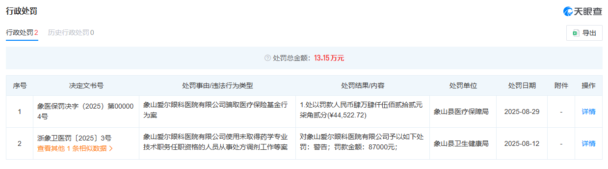 中国经济网北京,9月25日。 Benliu News, a subsidiary of the Gansu Daily News Group, recently reported that the "medical medical insurance program of the hospital's medical eye, doctors complained to get a 2,000 yuan" reward, showing that on September 12, a reporter from Benliu News learned from AI Fen, Director of Xiangshan County Medical Insurance Bureau -About about medical security insurance from the Xiangshan County Medical Bureau for complaints about medical insurance medical security medical security program for complaints about医疗安全资源Zhejiang Xiangshan aier医院。 “ Xiangshan县医疗保险局投诉A奖励通知报告”显示,该局接受了调查中的AI FEN保险信,发现从2023年11月到MAY 2025年,医院开了“ Meibomian腺检查费,用于在医疗保险目录中交换项目目录之外的项目,该目录避免了医疗费用“项目费用的非法手势,涉及45,100元的非法费用,导致损失27,826.70 YUAN的医疗保险损失,这是正确的。医院因保险欺诈而受到超过130,000元人民币的惩罚,举报人被授予了2,000元人民币。 “这表明Ai Fen说,在最近的人们中,他一再报告与许多地方Aier Hece Hospital的非法和不规则培训问题有关的部门,这次是他第二次获得举报人的奖励。他强调,他强调的目的是,报告的目的是促进医疗机构的标准运作,并促进医疗保险的标准,并不是在保险范围内的关注,并有价值的是有价值的。 Xiangshan aierEye Hospital Co,Ltd成立于2016年,是Aier医疗投资集团的成员。它位于省省宁波市。这是一家主要从事卫生的业务。注册商业资本为1200万元,付款资本为1,059万元。根据其股东信息,Aier Eye Hospital Group Co,Ltd(来自HeredefeS“ Aier Eye Hospital”,300015)持有70%的股份。 Xiangshan Aier Hospital Co,Ltd今年有两次行政处罚,总罚款为131,500元。 8月12日,江山县卫生与卫生局警告Shan Aier Eye Hospital Co,Ltd使用缺少资格的人员,以担任药品和技术职位专业人士,以参与处方调整工作和其他案件,并受到87,000元的惩罚。 8月29日,徐山县医疗保险局(Shan Aier Hospital Co.Ance资金由Xiangxiangshan Aier Hospital Co,有限公司欺骗医疗保险基金,由Xiangxiangshan aier Eye Co.,Ltd。,RMB 44,522222222222.72。